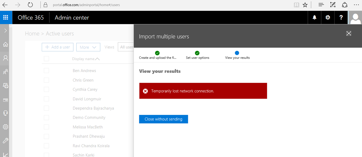 They selected the license for those users who are going get created and selected on ‘Next’ but after the few minutes… error got appear saying ‘Temporarily lost network connection’. I tried to get back and do this twice but got stuck with same issue. So, I selected ‘Close without Sending’.