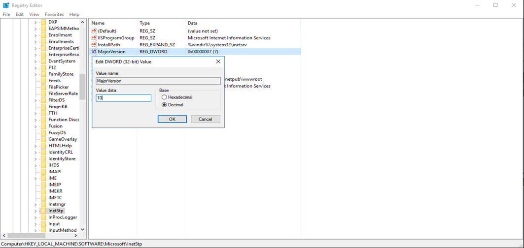 So, I quickly though to fake ‘rewrite_2.0_rtw_x64’ by changing the registry (which is not recommended but till the Microsoft release any other update this is only way I see). To fake the existence of IIS, I went to the registry key ‘Computer\HKLM\Software\Microsoft\InetStp’. On this registry, I made the change on string ‘MajorVersion’ to 7 from 10.