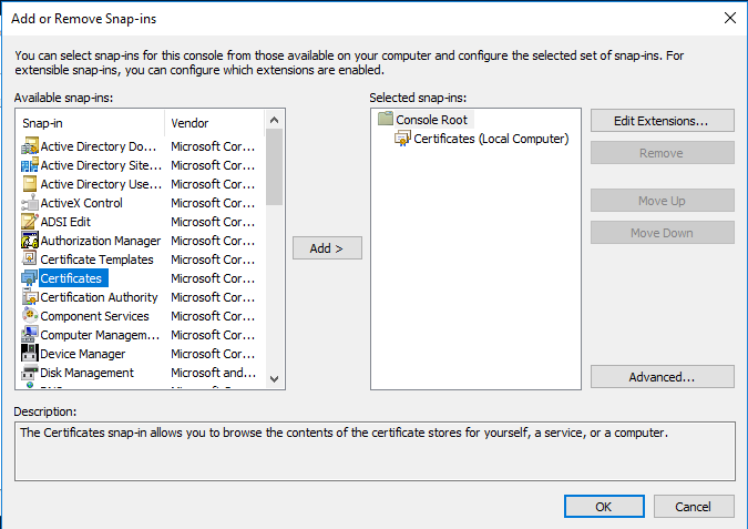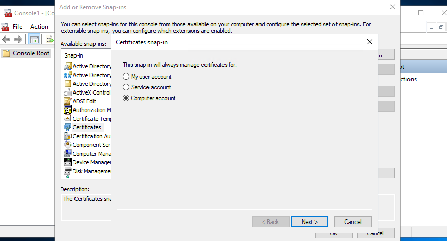 On ‘Microsoft Management Console (MMC)’, ‘Add or Remove Snap-ins’ using computer Certificates