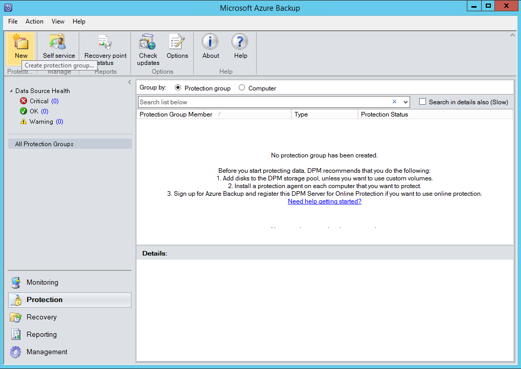 To get protect the server, click on ‘Protection’ lower left panel and click on ‘New’ on the top ribbon.