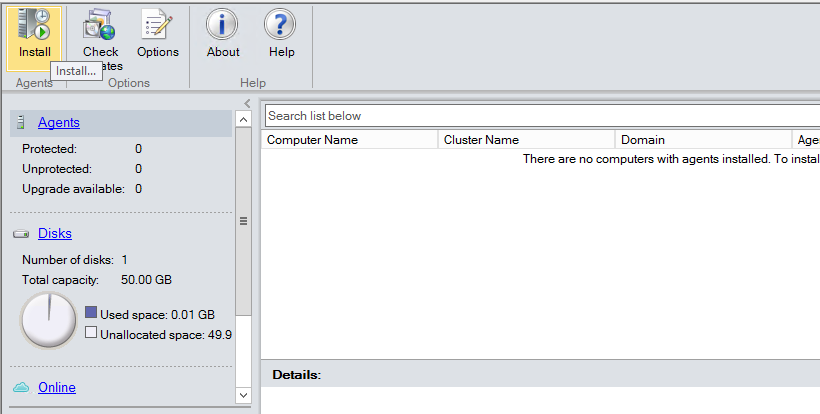 To install the agent, select in ‘Agents’ and click on ‘Install’ at the top of the ribbon.