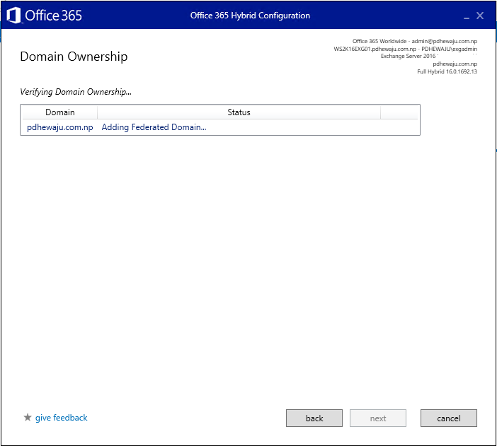 During the Office 365 Hybrid Configuration, while verifying the domain Ownership my configuration screen got hunged on ‘Adding Federated Domain…’. Initially I thought there might be some wrong on my configuration, hence tried to reconfigure again. But this time also the issue was same.